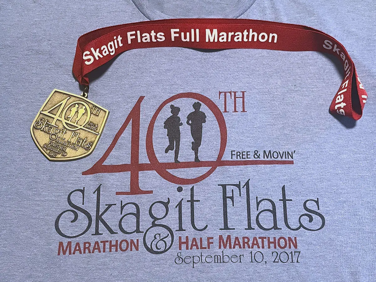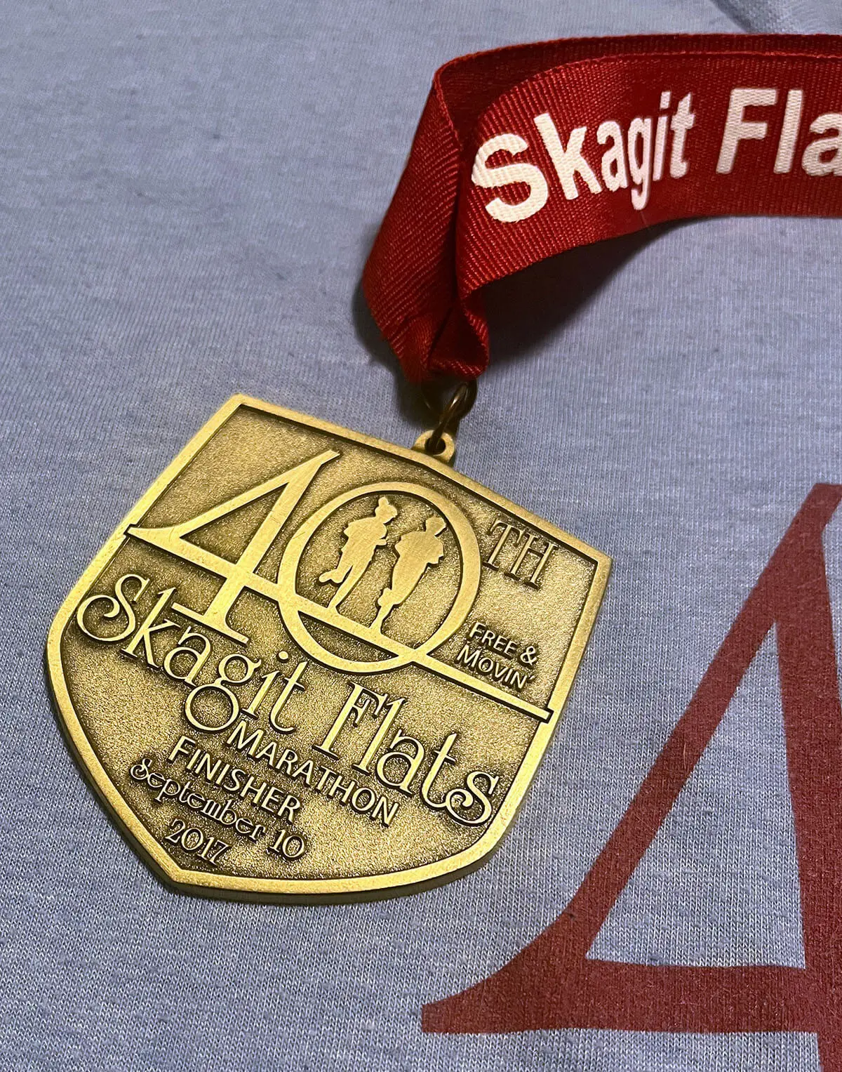 My design for the 40th running of the Skagit Flats Marathon provided an opportunity to design for silk screen printing, as well as dimensional metal casting. Three medals were designed for this event: Full Marathon, Half Marathon, and 5-Mile events. The overall designs remained the same, with differences being the distance text, metal color (gold, silver, bronze), and the lanyard colors and text.