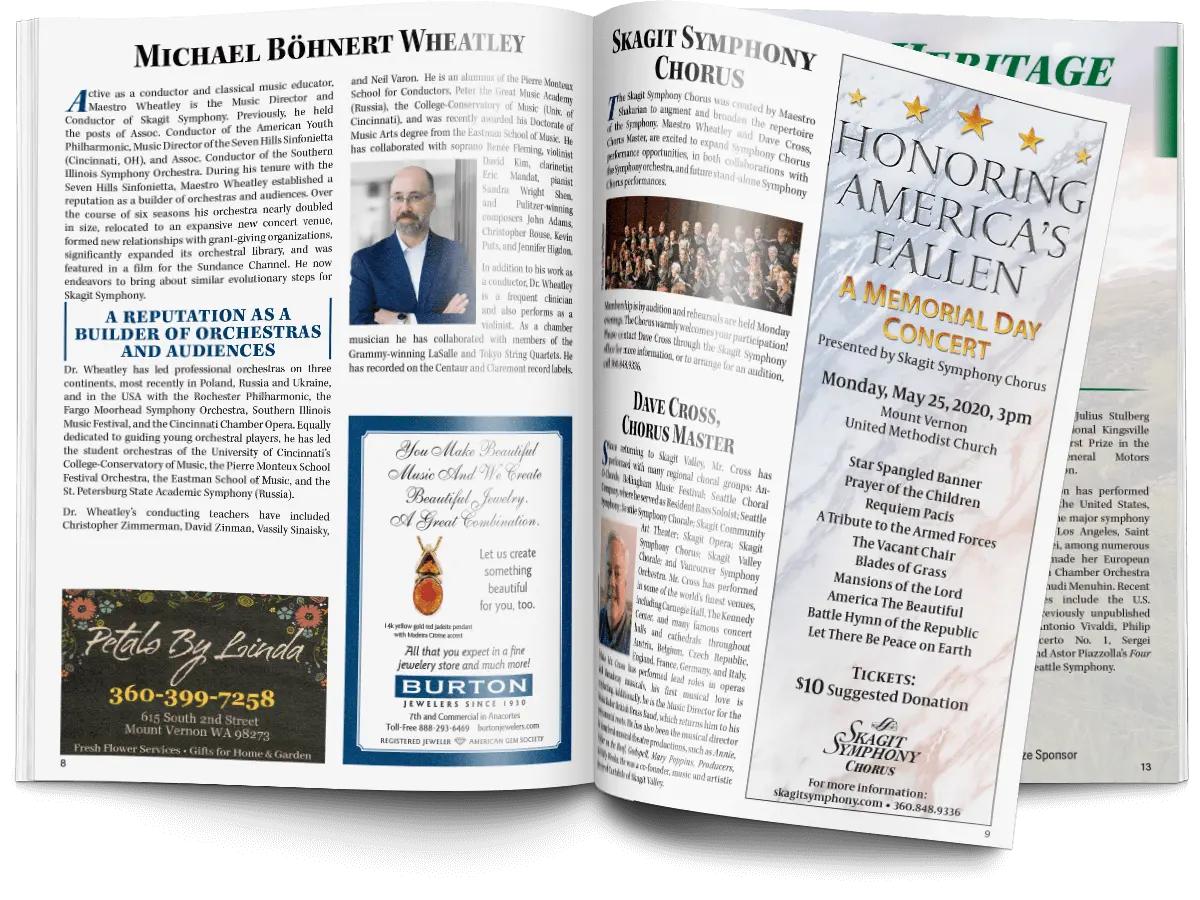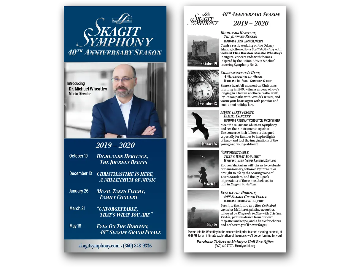The 2019-2020 season for Skagit Symphony saw the introduction of their new Conductor and Music Director, Michael Wheatley. Through connections with members of the Symphony management, I sought–and was granted an opportunity to take a fresh look at how the Symphony handled their concert programs, leveraging the change of Music Director to do so.