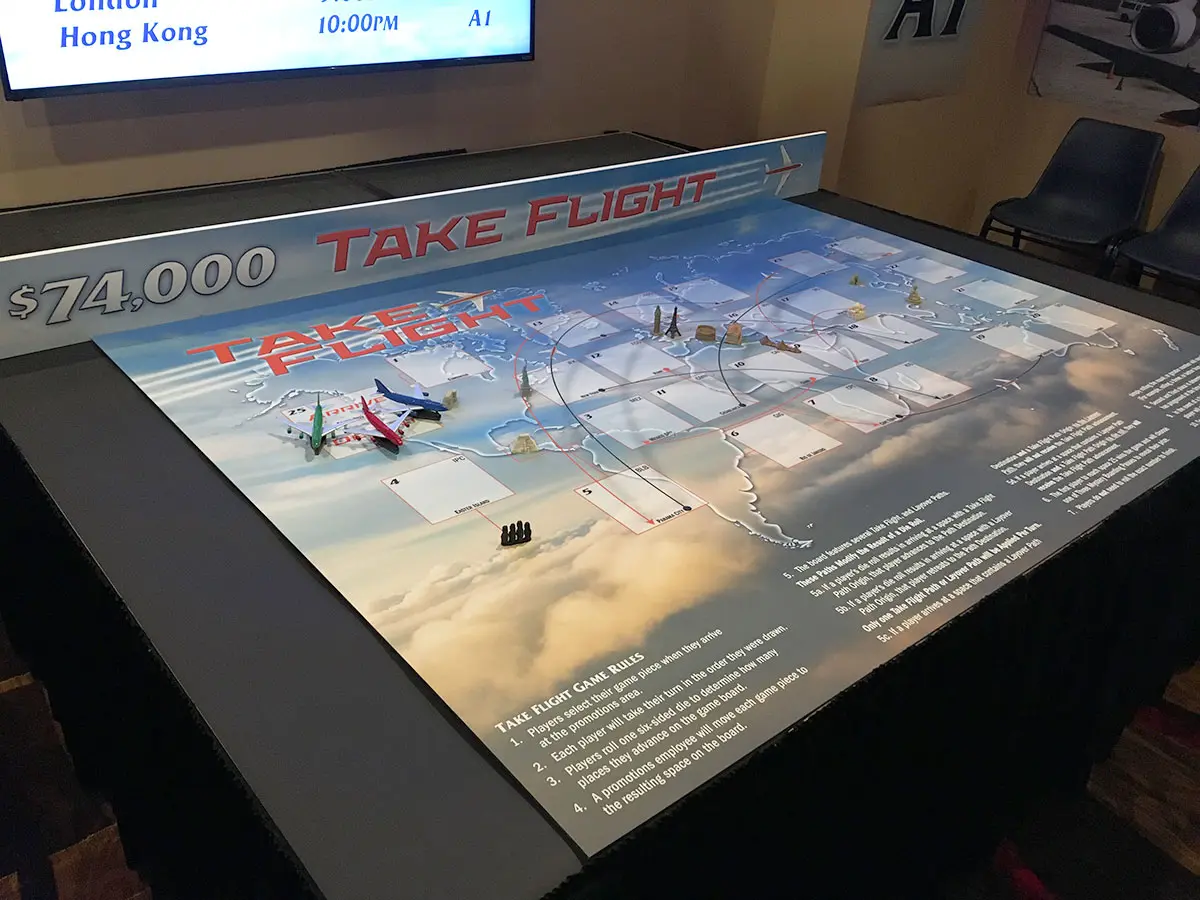 In addition to the game board, pictured here, the entire area was decorated to resemble an airport terminal, with a gate number, digital departures board, chairs, and even a faux window looking out to an airplane at the gate. All pieces were designed, and produced in house, whichI was responsible for. I also coordinated with various departments to source, and set up additional components from their respective areas.